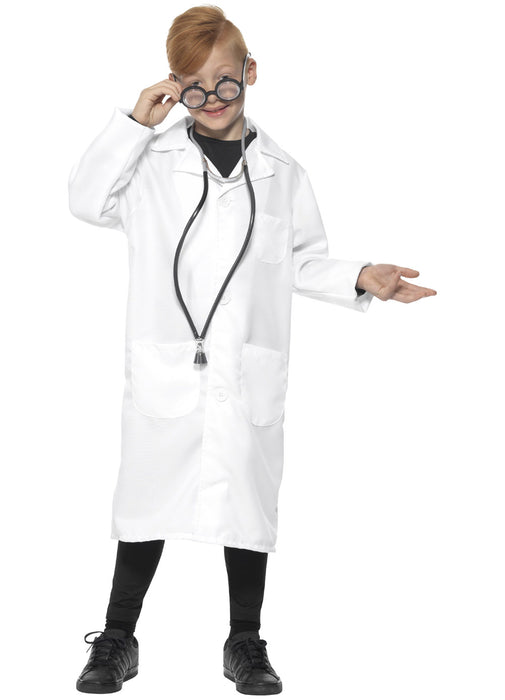 Unisex white lab coat costume perfect for a scientist or doctor outfit with three pockets and buttoned up front.
