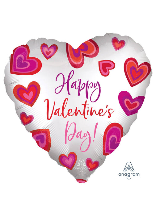Satin 2-sided design Happy Valentine's Day foil balloon with multiple hearts design.