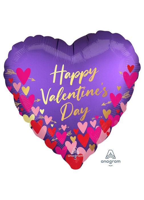 Satin purple Happy Valentine's Day foil balloon with arrow through hearts design with gold lettering.