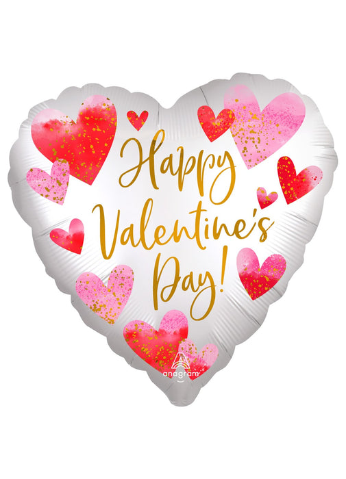 Satin infused watercolour design hearts Happy Valentine's Day foil balloon in white, red, gold and pink.