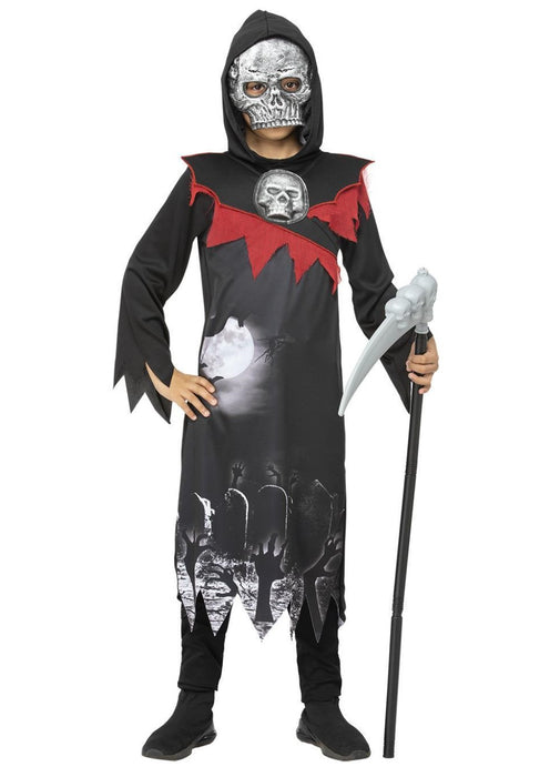 Grim Reaper costume with long black printed graveyard design robe with hood and EVA skull chest piece along with skull face mask.