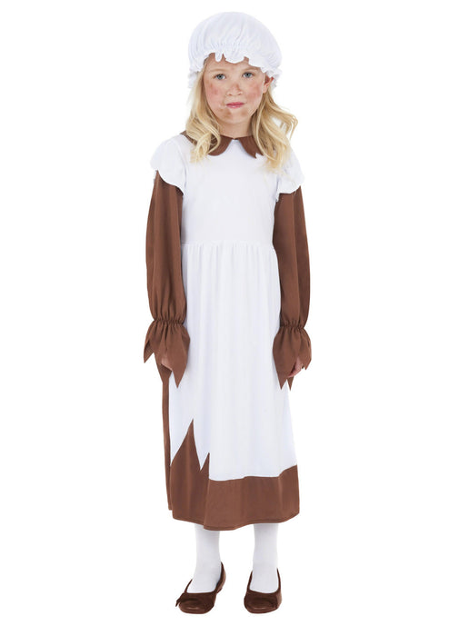 Poor Victorian girl fancy dress costume consisting of long brown and white dress with apron look front and finished with a white bow on the back along with a traditional looking white mop hat.