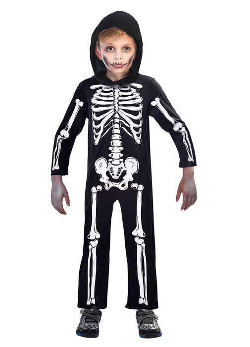 Hooded all in one child's Halloween costume consisting of printed skeleton design jumpsuit. A value for money outfit!
