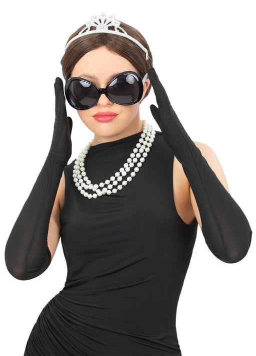 5-piece fancy dress costume accessory Tiffany Diva kit with sunglasses, plastic tiara, pearl necklace and pair of long black gloves.