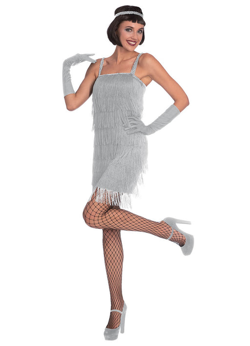 20's ladies silver flapper dress with sequin trim, matching headband and pair of long gloves. Size Dress Small 8-10 Medium 10-12 Large 14-...