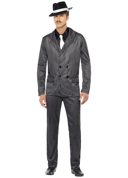 Black pinstriped gangster costume consisting of elasticated trousers, matching jacket with fake buttons and velcro fastening, black mock shirt &...