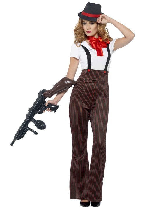1920's Glam Gangster fancy dress costume consisting of red and black pinstriped trousers, white top, mock black braces, red neck tie with bow &...