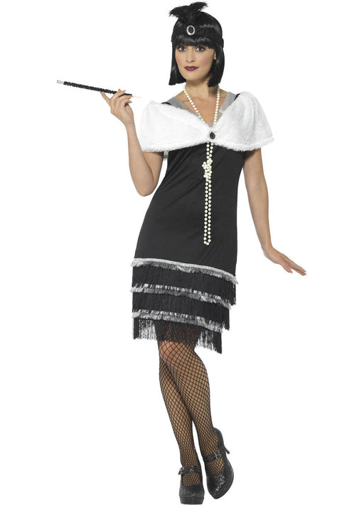 Black 1920's flapper fancy dress outfit with v-neck finished with black and silver fringe, black jewelled headband with feathers and white faux fur...