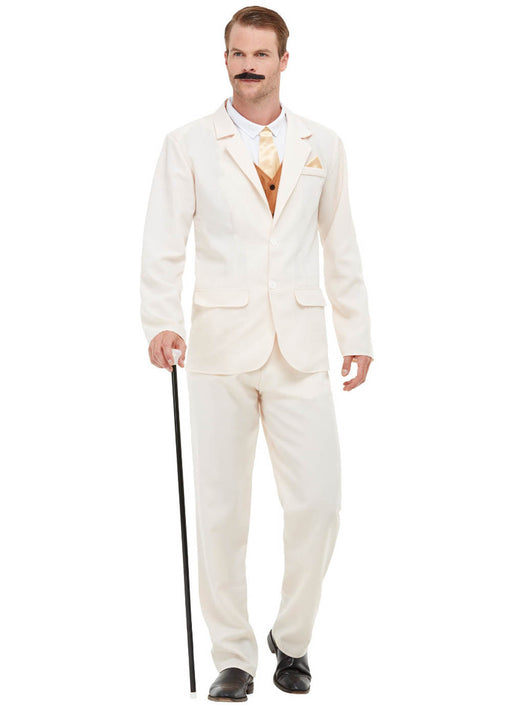 Beige 1920's gentlemen tuxedo costume with trousers, jacket and all in one mock shirt, waistcoat piece. A great alternative to your typical 20's ga...