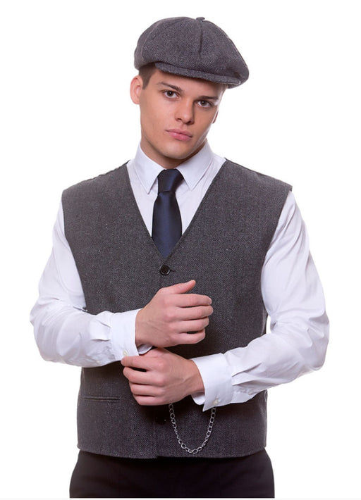 Traditional style 20's gangster man costume with buttoned waistcoat with silver chain and cap. Model is wearing own shirt and tie. Size Chest Wa...