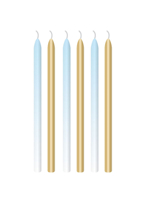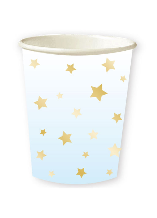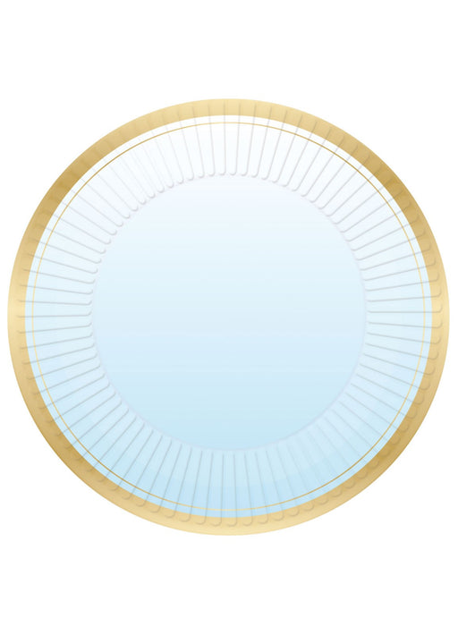 Pack of 8 blue paper party plates with metallic gold trim measuring 23 cm.