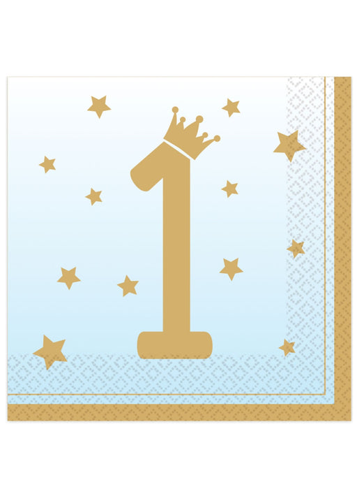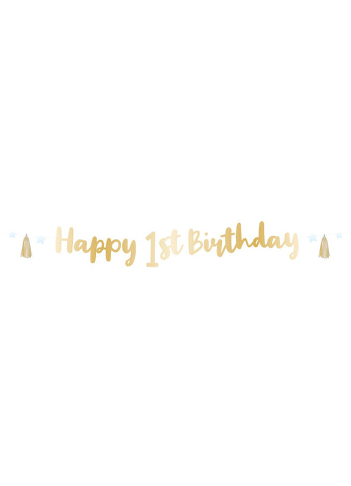 1.8 metre long Happy 1st Birthday letter banner with gold writing and blue decorations.