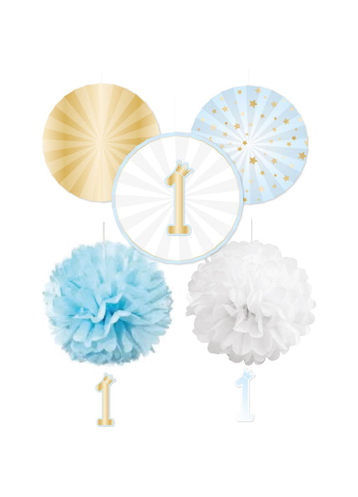 5-piece 1st birthday blue, gold and white decoration kit with 2 x fluffy decorations with hanging number 1's and 3 x different designed paper fans.
