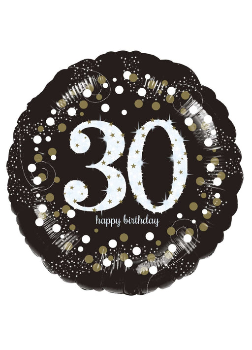 Gold Sparkle 30th birthday holographic foil balloon decorated with spots. Click & Collect orders: Balloon supplied inflated with helium. Deli...