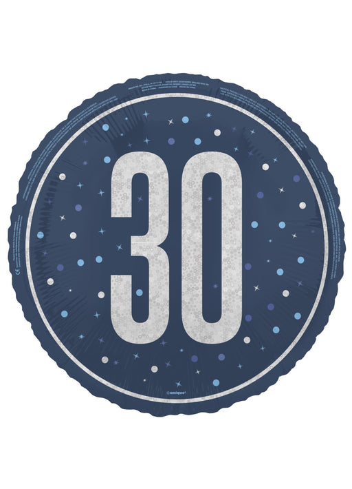 Blue Glitz 30th Birthday 18" circle shaped helium balloon printed both sides. Click & Collect orders: Balloon supplied inflated with helium. ...