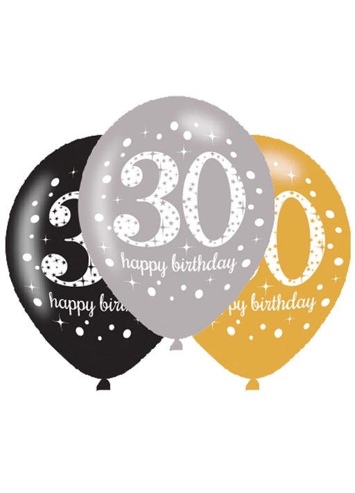 Pack of 6 30th birthday Gold Celebration 11" balloons in 3 assorted colours. Printed all over. Supplied deflated and suitable for air or helium inf...
