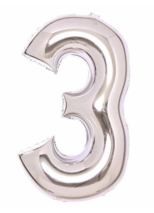 Giant number 3 silver super shape foil balloon measuring approx. 86 cm (34") in height. Click & Collect orders: Balloon supplied inflated wit...