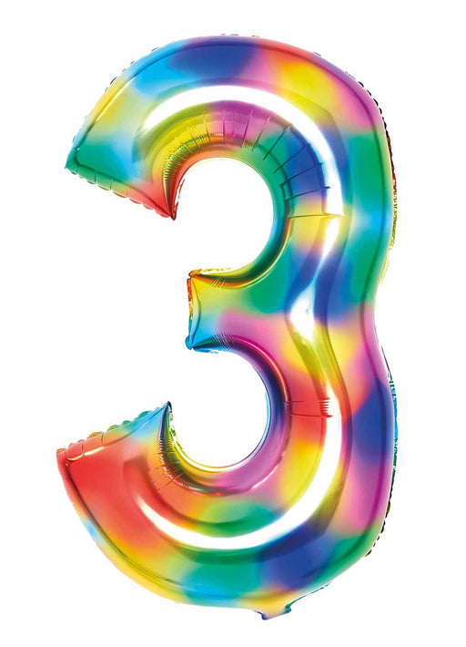 Giant number 3 rainbow splash super shape foil balloon measuring approx. 86 cm (34") in height. Click & Collect orders: Balloon supplied infl...