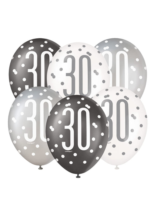 Pack of 6 age 30 Birthday Black Glitz 12" latex pearlized balloons in assorted colours. Printed all over. Supplied deflated and suitable for air or...