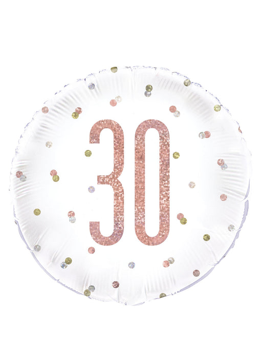 Rose Gold Glitz 30th Birthday 18" circle shaped helium balloon printed both sides. Click & Collect orders: Balloon supplied inflated with hel...