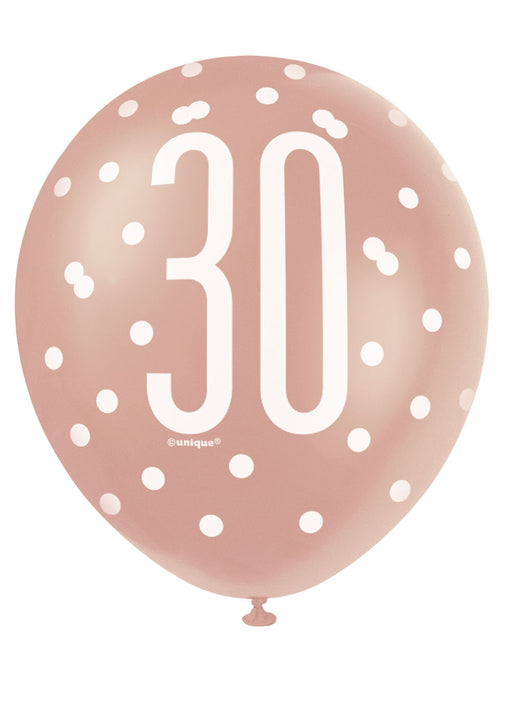 Pack of 6 age 30 Birthday Rose Gold Glitz 12" latex pearlised balloons in assorted colours. Printed all over. Supplied deflated and suitable for ai...