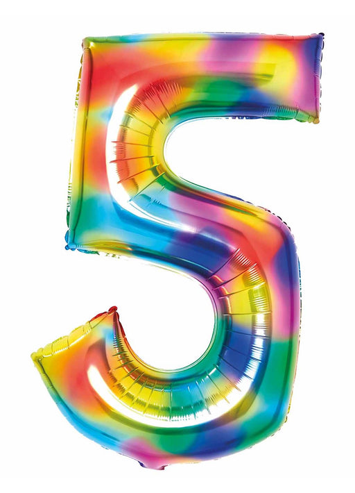 Giant number 5 rainbow splash super shape foil balloon measuring approx. 86 cm (34") in height. Click & Collect orders: Balloon supplied infl...