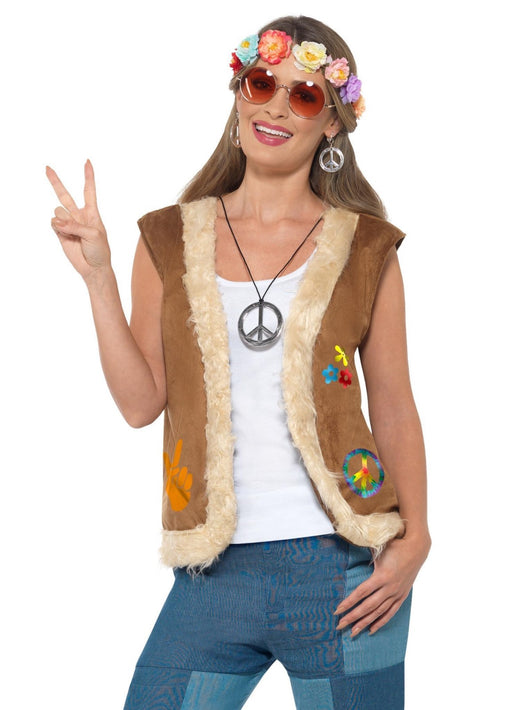 Unisex brown hippie waistcoat fancy dress piece with CND print and faux fur trim. Size Chest Dress Size Small/Medium 34''-40'' 8-14 Large/X...