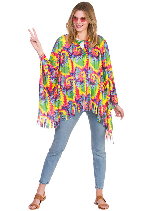 One size fits most 1960's hippy style tie dye poncho. Great, easy and comfortable 60's fancy dress option!