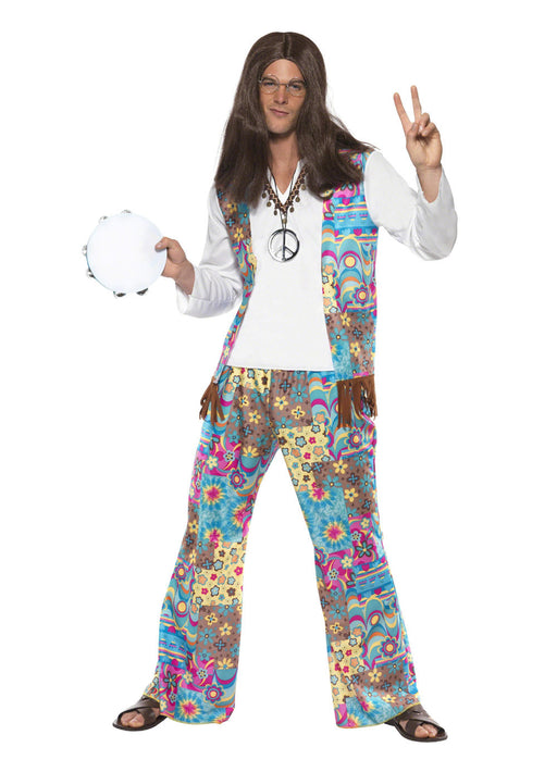 This Groovy 60's Hippie costume consists of all in one white top with patterned collar and attached frilled waistcoat, patterned trousers and match...