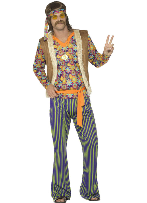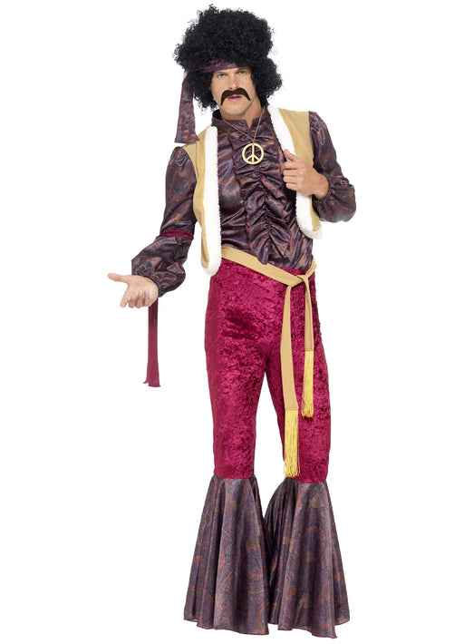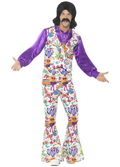 Head back to the 60's with the groovy hippie costume consisting of colourful printed flares, matching waistcoat & purple shirt. Size Chest...