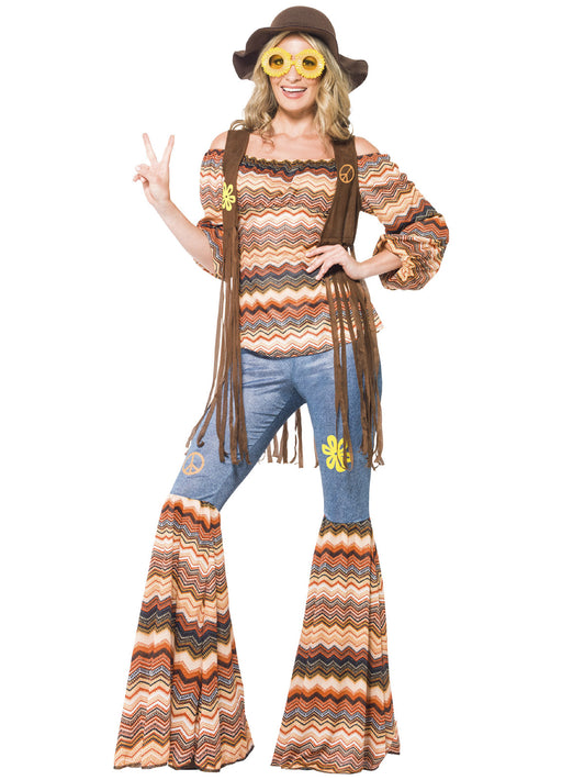 1960's style Groovy Lady costume adult. Costume includes floral hippie dress with draped arms, brown waistcoat with long dangling tassels and hippi...