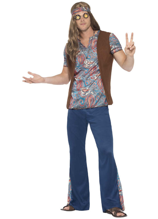 Orion the Hippie fancy dress costume consisting of paisley print top with attached brown waistcoat, blue elasticated trousers, matching headscarf &...