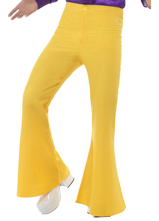 60's themed yellow flared trousers with elasticated waist and iconic flared trouser leg. Size Chest Waist Inside Leg Medium 38''-40'' 32''-3...