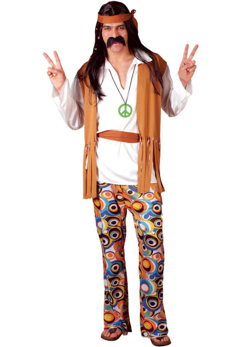 1960's hippie men's fancy dress costume with brown and psychedelic pattern designed top, trousers and headscarf.