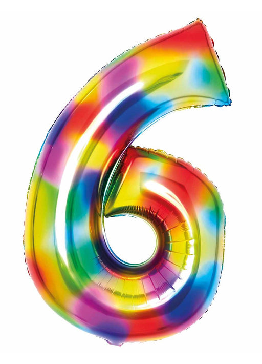 Giant number 6 rainbow splash super shape foil balloon measuring approx. 86 cm (34") in height. Click & Collect orders: Balloon supplied infl...