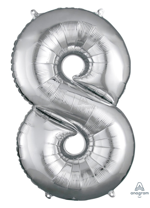 Giant number 8 silver super shape foil balloon measuring approx. 86 cm (34") in height. Click & Collect orders: Balloon supplied inflated wit...