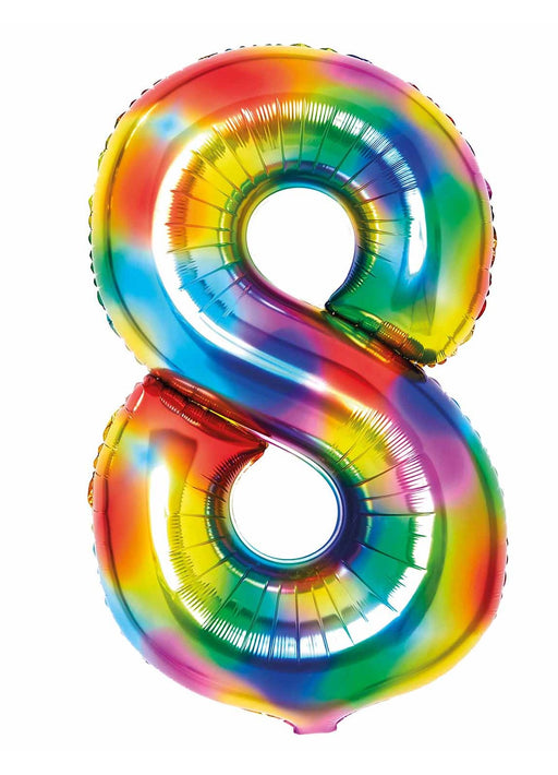 Giant number 8 rainbow splash super shape foil balloon measuring approx. 86 cm (34") in height. Click & Collect orders: Balloon supplied infl...