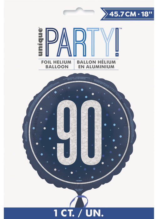 Blue Glitz 90th Birthday 18" circle shaped helium balloon printed both sides.
