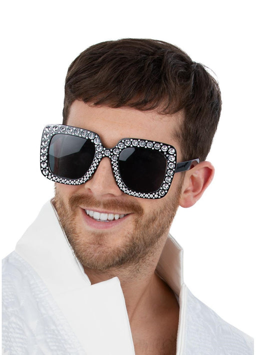 70's style disco glasses with jewelled black frame and black tinted lenses.