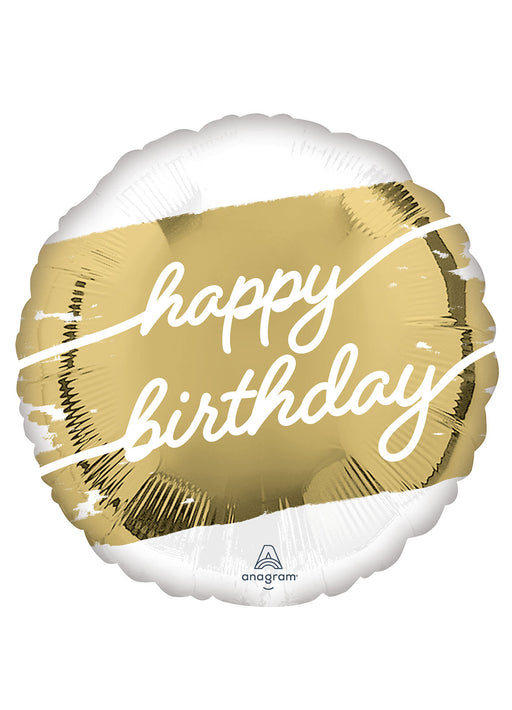 Gold and white 17 inch round Happy Birthday foil balloon. Click & Collect orders: Balloon supplied inflated with helium. Delivery orders: Ba...