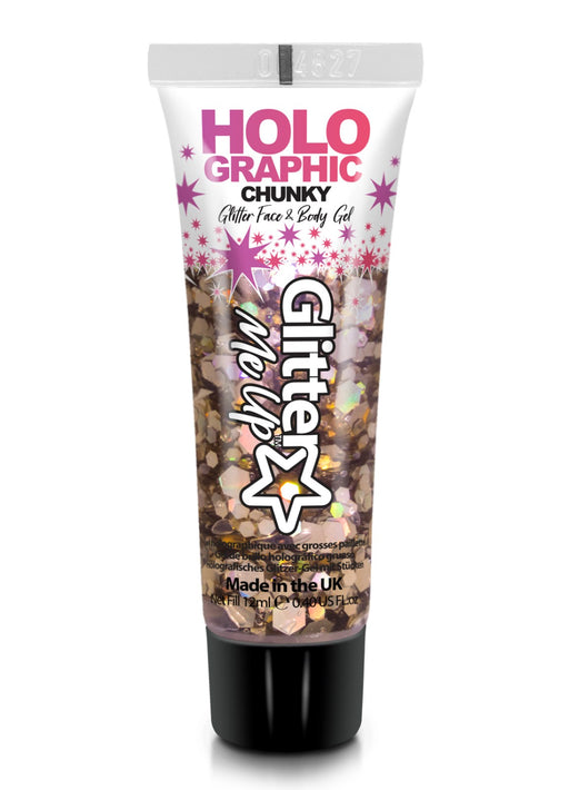 12ml of holographic chunky glitter face and body gel in gold. Application couldn’t be easier - the pre-mixed formula means no glue is needed. Simpl...