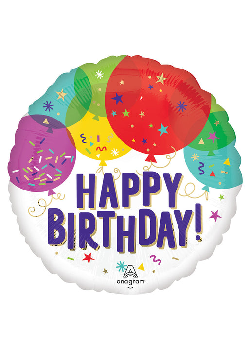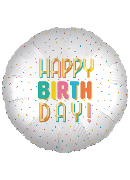 17 inch round Happy Birthday bright sprinkle design foil balloon. Click & Collect orders: Balloon supplied inflated with helium. Delivery or...