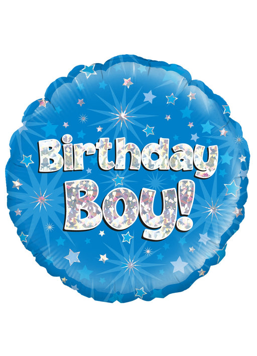 Blue Birthday Boy holographic standard round foil balloon measuring 18" (45.7 cm) when inflated. Made in UK. Click & Collect orders: Balloon ...