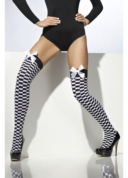 Complete your sexy fancy dress outfit with these black and white check stocking with white satin bow.