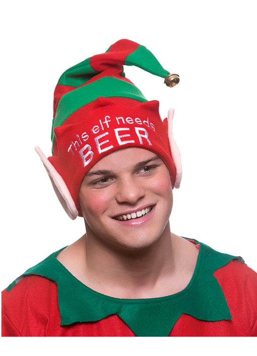 Deluxe Christmas pointed Elf hat with ears and bell with the slogan "Thsi Elf Needs Beer".