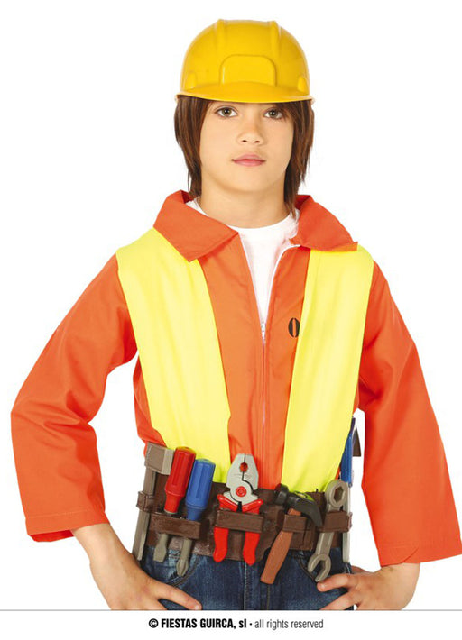 Child's size builder's plastic belt with 8 tools and yellow plastic hard hat.