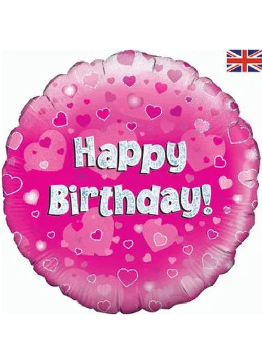 Pink Happy Birthday holographic standard round foil balloon measuring 18" (45.7 cm) when inflated. Made in UK. Click & Collect orders: Balloo...