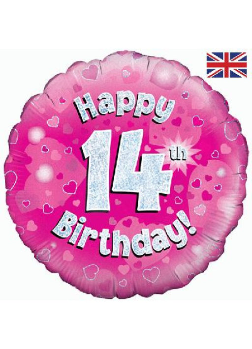 Pink age 14 holographic standard round foil balloon measuring 18" (45.7 cm) when inflated. Made in UK. Click & Collect orders: Balloon suppli...