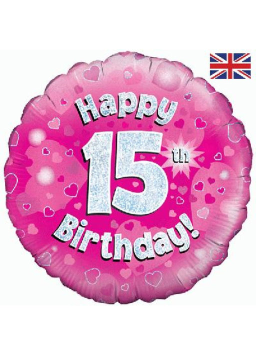 Pink age 15 holographic standard round foil balloon measuring 18" (45.7 cm) when inflated. Made in UK. Click & Collect orders: Balloon suppli...