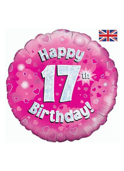 Pink age 17 holographic standard round foil balloon measuring 18" (45.7 cm) when inflated. Made in UK. Click & Collect orders: Balloon suppli...